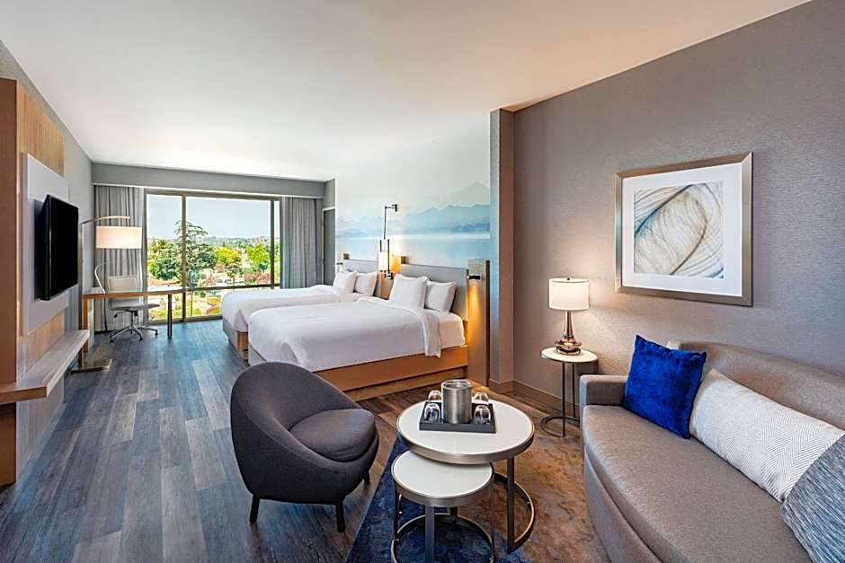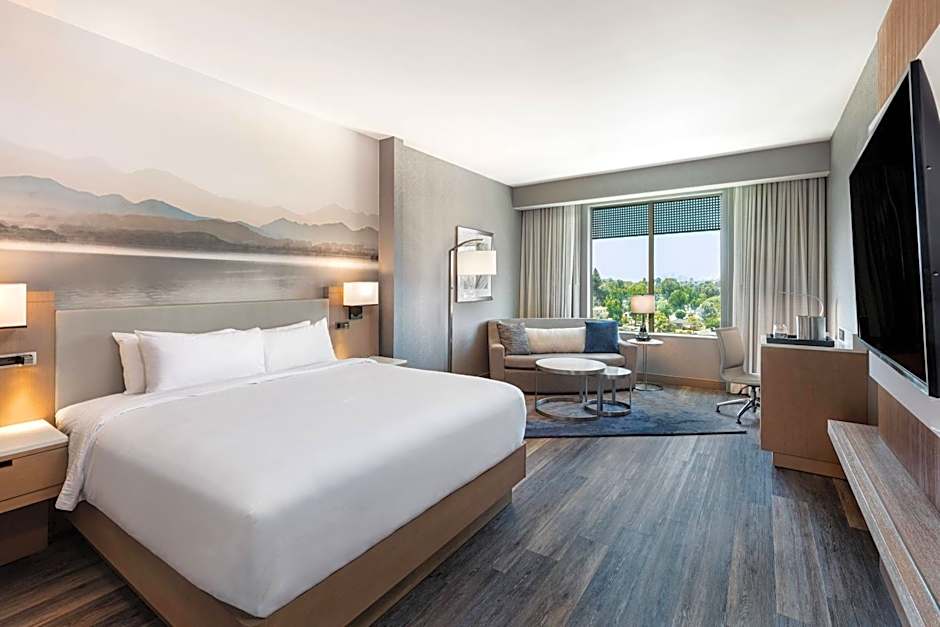 The Courtyard by Marriott Los Angeles Monterey Park offers a variety of room types, including standard king rooms, guest rooms with two queen beds, larger guest rooms with a king bed and sofa bed, one-bedroom suites with a king bed and sofa bed, and one-bedroom suites with two queen beds and a sofa bed. All rooms are non-smoking and have an average size of 366 sqft, except for the larger guest rooms and suites which have a size of 560 sqft or 786 sqft. The rooms can accommodate between 2 to 5 adults, with additional space for 1 to 4 children.