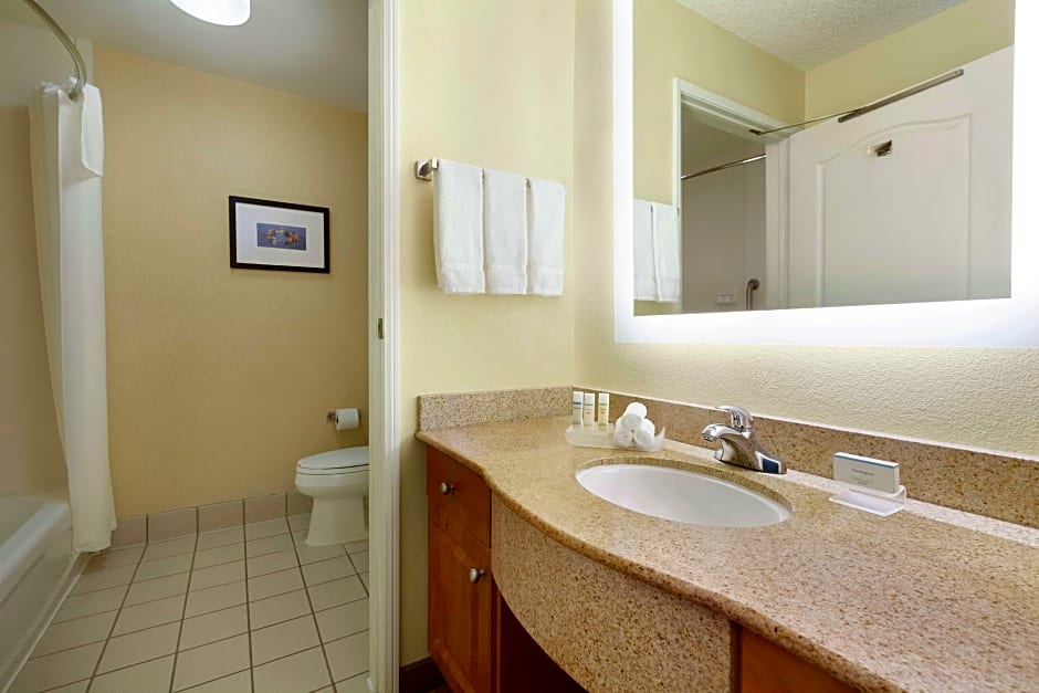 This mobility accessible non-smoking studio suite features one queen-sized bed, and an accessible bathtub. This suite has a kitchen built to lower scale with full-sized refrigerator, microwave, dishwasher and twin burner stove - plus utensils - to make dining in easy. For added convenience and flexibility, there is a HDTV, a full-sized sofa bed as well as an additional work table and chair, separate from the dining area table. This suite will keep you connected with complimentary internet access, telephone, and alarm clock with MP3 player capabilities and pre-set local radion stations. Any corresponding photo may not reflect the specific accessible room type or room feature.