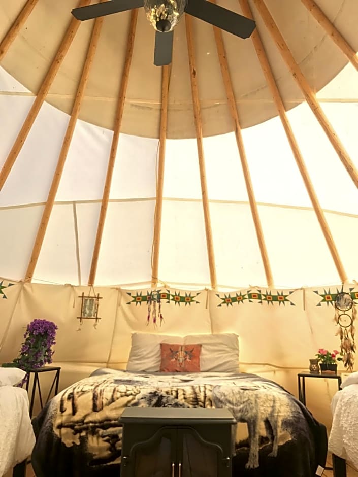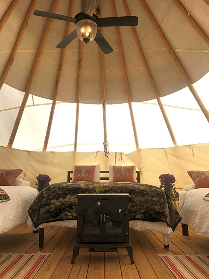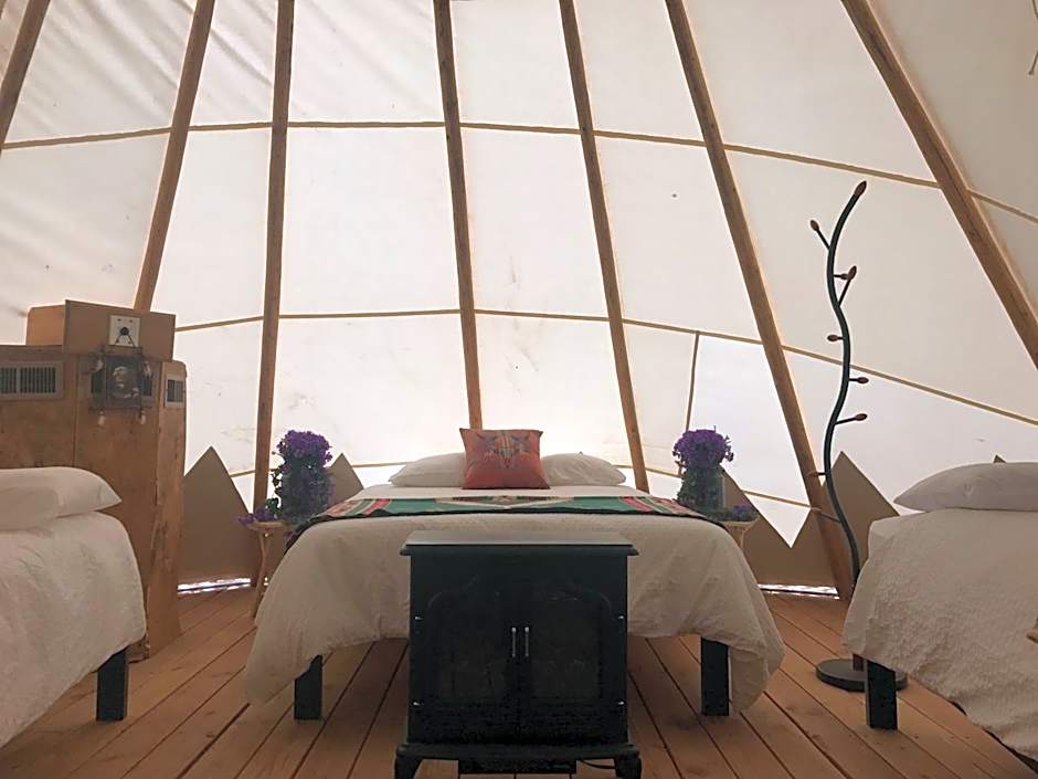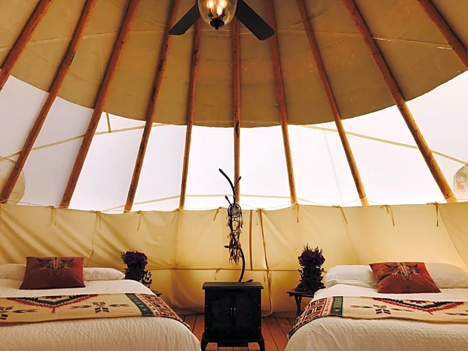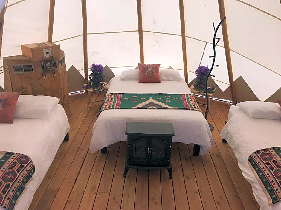 Also known as "Coyote," this teepee-style tent sleeps up to 6 and includes premium bedding with duvet/comforters, a ceiling fan, heating and air conditioning.