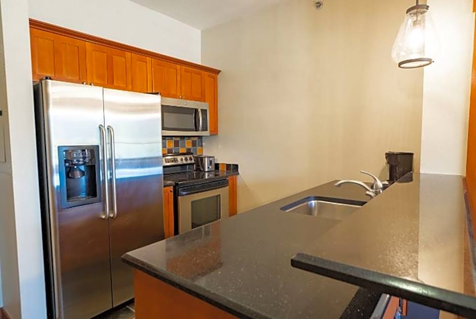 Featuring a fireplace, this two-bedroom apartment features an private bathroom in the master bedroom. A full bathroom is located adjacent to the living space and second bedroom. A full kitchen and a seating area with a cable TV is provided.