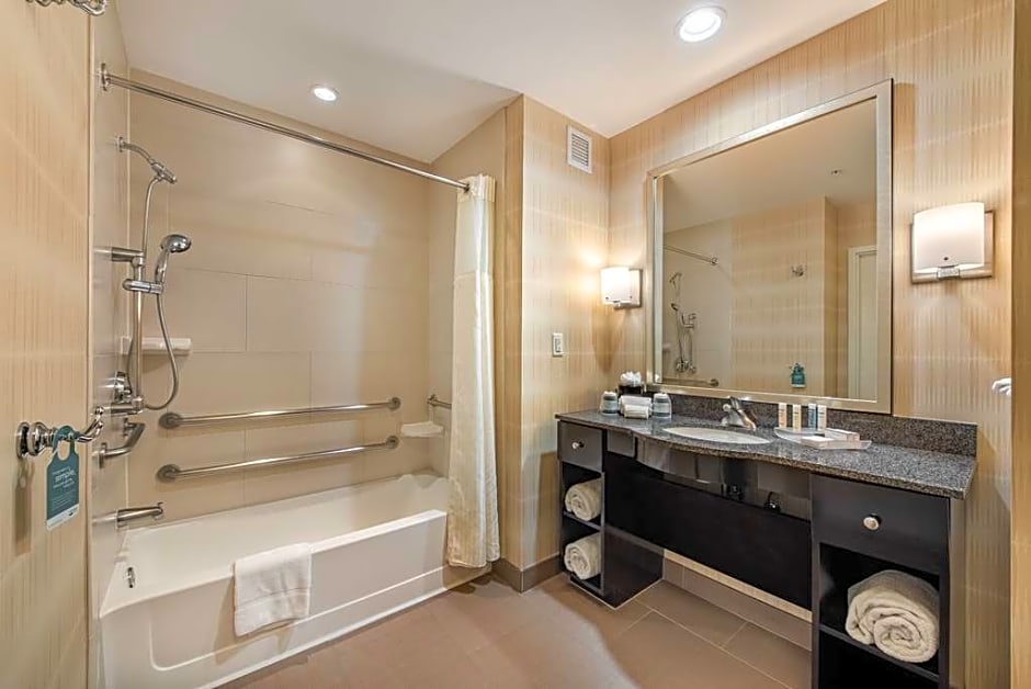 This air-conditioned hearing accessible, nonsmoking suite features a visual alarm and notification devices for the doorbell or door knock and incoming telephone calls. It includes a flat-screen cable TV and a seating area.