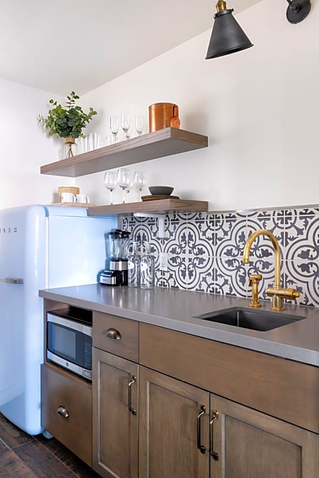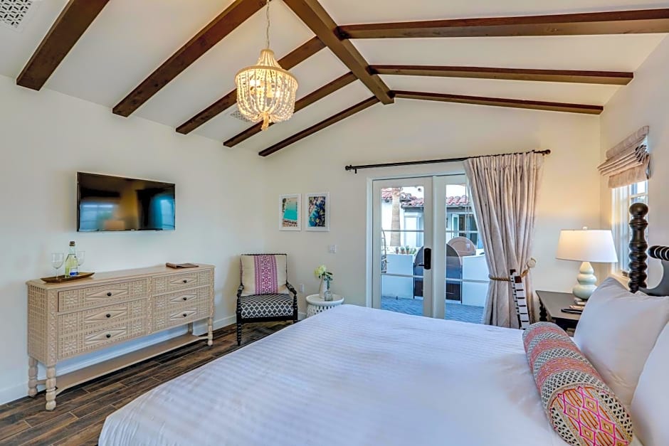 Located next to the Palm Courtyard, this one bedroom bungalow suite features a separate bedroom with a king size bed and a 40" flat screen TV. Separate living room with a fireplace, queen size pull out couch and 40" flat screen TV, this suite sleeps 2. A full kitchen complete with oven/stovetop, fridge, sink, microwave, blender, and Keurig coffee maker. 865 square feet of luxurious space with a beautifully appointed bathroom with a claw foot bath tub, huge shower and double sinks in the bathroom. Separate powder room for guests. Front porch with private patio and a large private back patio with a beautiful outdoor claw foot bath tub, fire pit and built in seating area. Luxurious Frette linens and towels. L'Occitane skin and bath products. Robes, hairdryer, iron and ironing board.
