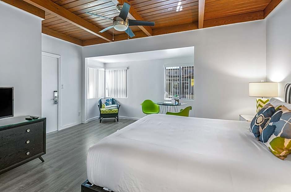 The location is fantastic! Right in downtown PS. The pool is very clean and well maintained as is the outside of the entire property. Our room was very spacious and comfortable with lots of amenities including a kitchenette with keurig, microwave, hot plate and the necessities needed for cooking. The bed was very comfortable and the room decor is vey nice giving that quintessential 60’s mid century modern vibe.