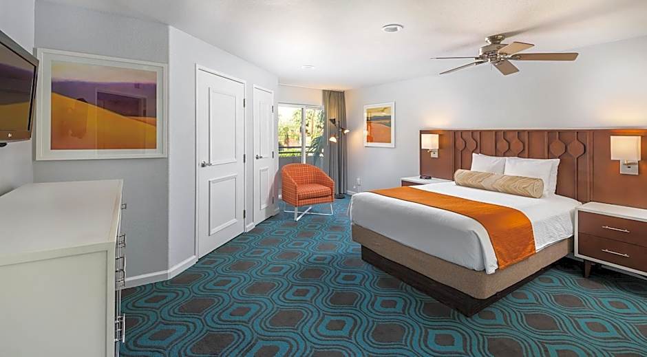 The WorldMark Palm Springs hotel offers a variety of rooms including studio rooms, one-bedroom suites, and two-bedroom suites. The occupancy varies depending on room type, with studio rooms accommodating up to 2 guests and larger suites accommodating up to 6 guests. All rooms are non-smoking and feature a range of bed sizes from queen to king.