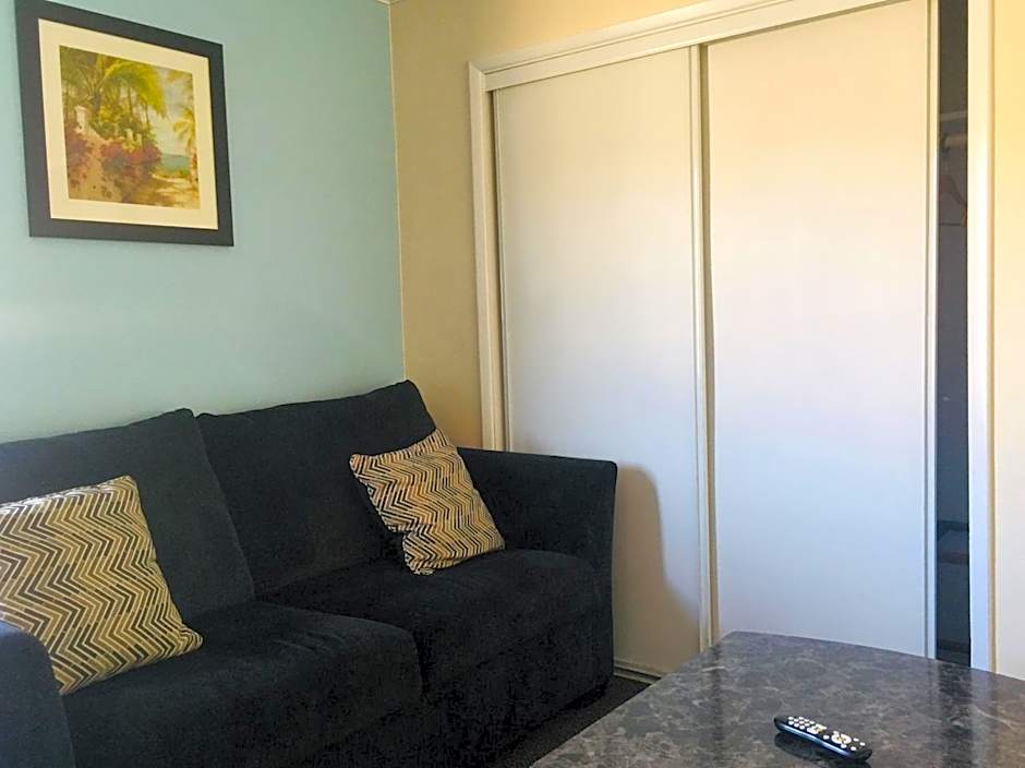 There wasn’t a dresser or table, no chairs inside the room so your only option was to sit on the beds. It was the room feel cramped to not have anywhere to put our luggage. There were cobwebs from the light in our single bed bedroom. We were too tired to call for the maintenance and just dusted it ourselves. For the price we paid I felt that was not right. The parking lot is directly next to the single level rooms. I wish there was a plant or some division between. Ultimately the location was the winning factor and we really enjoyed our stay.