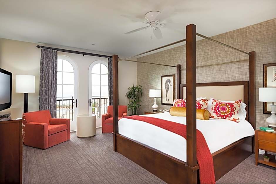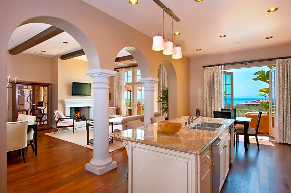 Overlooking the breaking waves of the Pacific Ocean, this 900 square foot Ocean Side Suite features a pillow-top king bed with goose-down pillows and luxurious linens. This generous suite offers a separate living room with queen size pull out couch, 5-fixture beautiful stone bathroom with separate tub and shower, guest bathroom, 1 42-inch LCD flat screen television, 1 55-inch LCD flat screen television, Bose Bluetooth speaker, full bar, three dual-line telephones with voicemail, in-room safe, available wireless internet, iron and ironing board, and a private balcony or patio. For family travelers, the suite can be expanded to a two-bedroom suite. Additional reservation charges will apply.