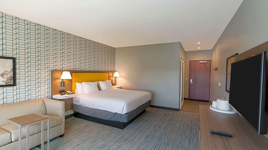 The hotel offers a Queen Room with Two Queen Beds that can accommodate up to 4 adults and 3 children. There is also a Large King Room with a Sofa Bed that can accommodate 2 adults and 1 child. Both of these rooms are non-smoking and have a room size of 301 sqft. Additionally, the hotel has a King Room - Mobility Accessible/Non-Smoking and a regular King Room, both of which can accommodate 2 adults and 1 child, and have a room size of 301 sqft. Smoking is not allowed in any of the rooms.