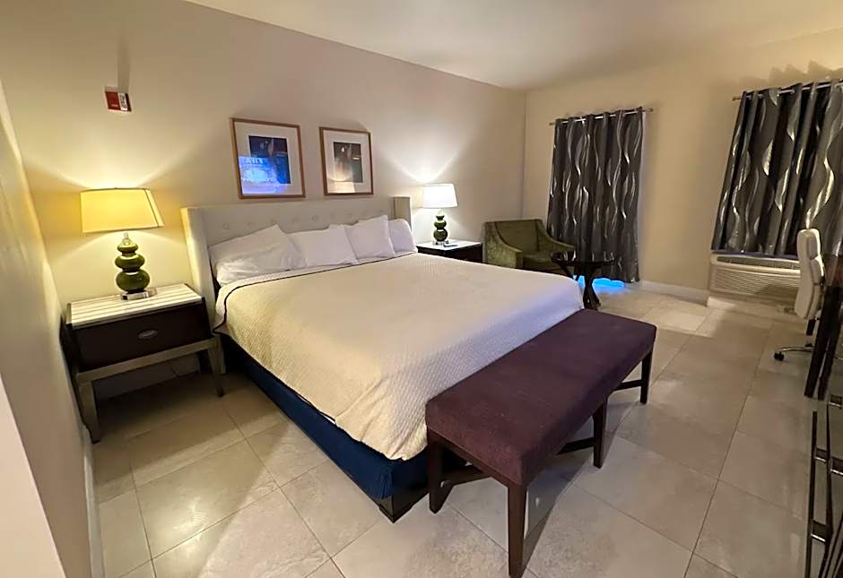 1 King Bed Mobility/Hearing Accessible Room Roll-In Shower Non-Smoking is 129 square feet and includes a king-size bed 150-183 width plus desk, satellite tv , and hairdryer.