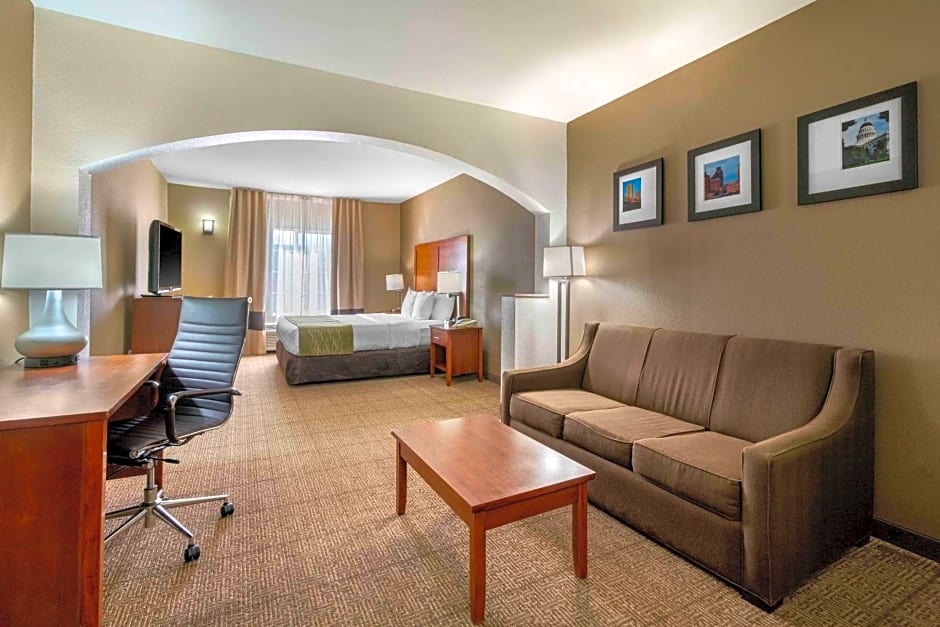 The Comfort Inn & Suites Sacramento – University Area offers various room types including Queen Rooms with Two Queen Beds (accessible/non-smoking), King Rooms (accessible/non-smoking), Queen Rooms with Two Queen Beds (non-smoking), King Suites (non-smoking), and Efficiency King Suites (non-smoking). The rooms range in size from 291 sqft to 764 sqft. All rooms are non-smoking and have different bed configurations to accommodate different occupancy needs.