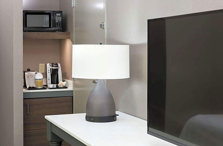 This hearing accessible room includes a flat-screen cable TV, a work desk, a seating area, a microwave and a refrigerator.