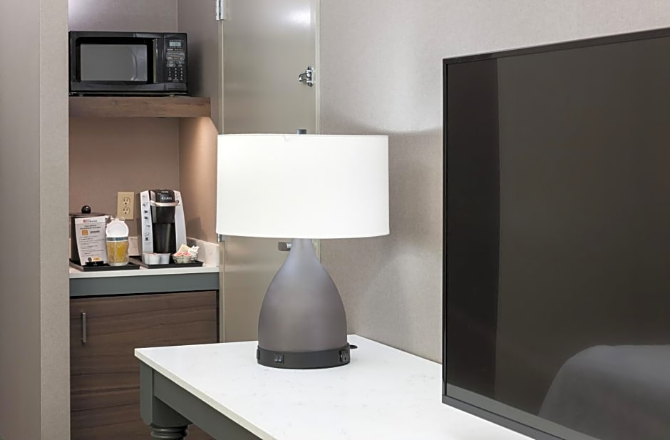 Complimentary WiFi, TV, desk, ergonomic chair, refrigerator, microwave. Unwind in this comfortable guestroom, complete with one king-sized bed and convenient amenities. Keep on top of business at the desk with an ergonomic chair, make use of the complimentary WiFi or entertain yourself with a movie on the 32-inch HDTV. Store and prepare your own meals and snacks with the refrigerator and microwave. Special touches include the adjustable Garden Sleep System Bed, a Keurig® in-room brewing system for coffee and tea, and complimentary bath products.