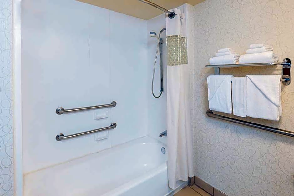 This mobility accessible, non-smoking room features one king-sized bed and an accessible bathtub. The room features comfortable soft seating, a HDTV, and easy to operate alarm clock/radio. The free WiFi access will help you stay connected while on the road. If you prefer not to work at the desk, you can use the convenient lapdesk instead. You'll also enjoy the convenience of having a coffeemaker with tea service and iron/ironing board in your room. Any corresponding photo may not reflect the specific accessible room type or room feature.