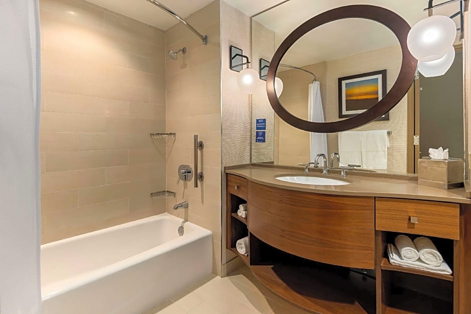 Guest room with a furnished, private balcony or patio overlooking the glistening pool. Recharge in the natural light that illuminates this 450 sq. ft. room by day and enjoy a restful night of sleep in a Hilton Serenity Collection bed by night. Additional features include a 55-inch TV, mini-refrigerator, coffee maker, desk, Wi-Fi, hairdryer, shower, luxury bath amenities and more.