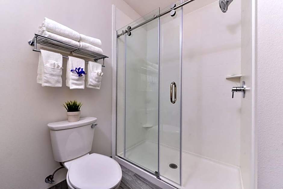 This room features a 48" HDTV with cable, large work desk with ergonomic chair, plush triple-sheeted bed, and walk-in shower.
