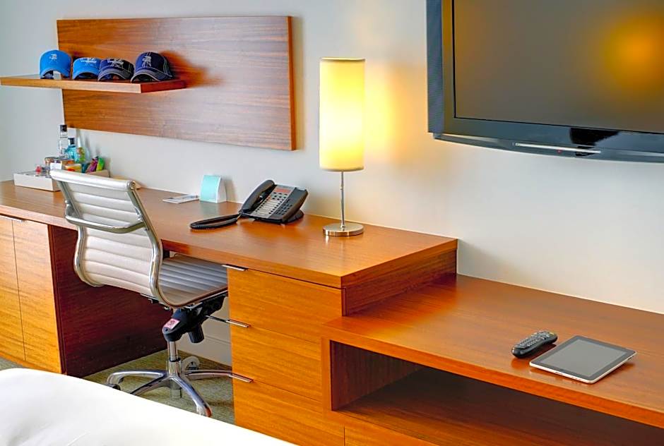 This room offers views of the Tower Deck and the hotel's water garden.