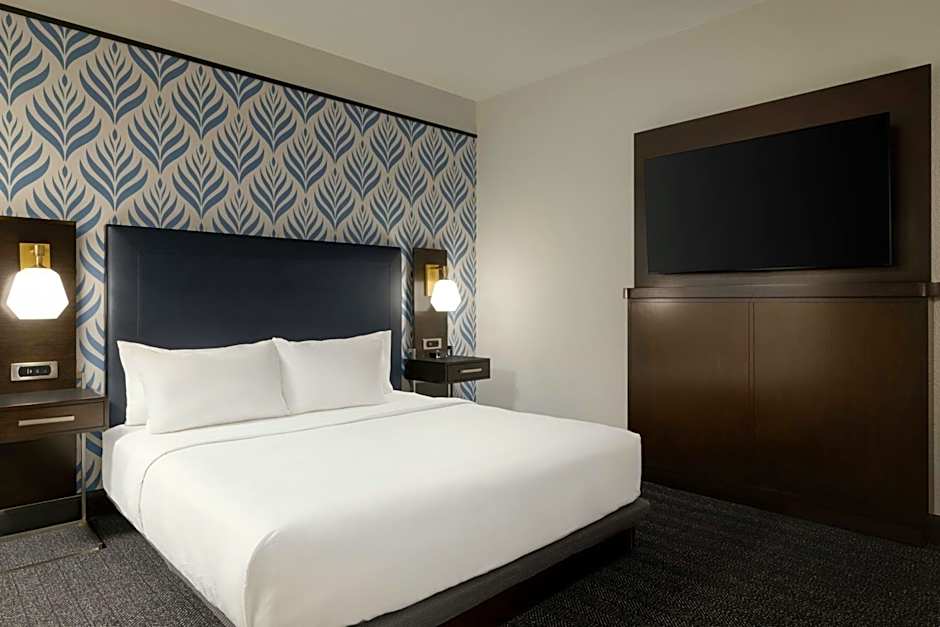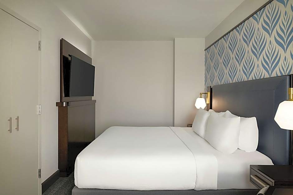 City views, luxury bedding and free WiFi are provided in this room. Calming modern white and gray linens are offered. Blue and yellow colored accents pop throughout the room. A flat-screen TV is and spa toiletries are also featured.
