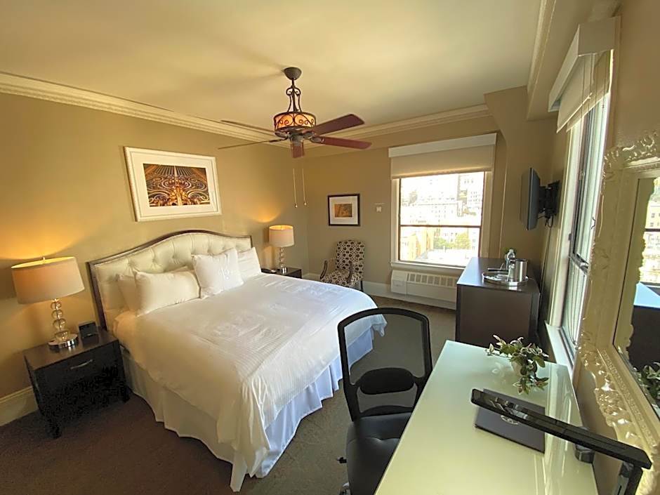 Located on floors 10 through 12, this room offers views of Union Square or Nob Hill. Cream tufted headboards, mahogany furniture, premium linens and Serta mattresses are offered in this room. Free high-speed wireless internet access, a 40-inch flat-screen TV, a ceiling fan, black-out drapes, a light-up makeup mirror and a writing desk are offered in this room.