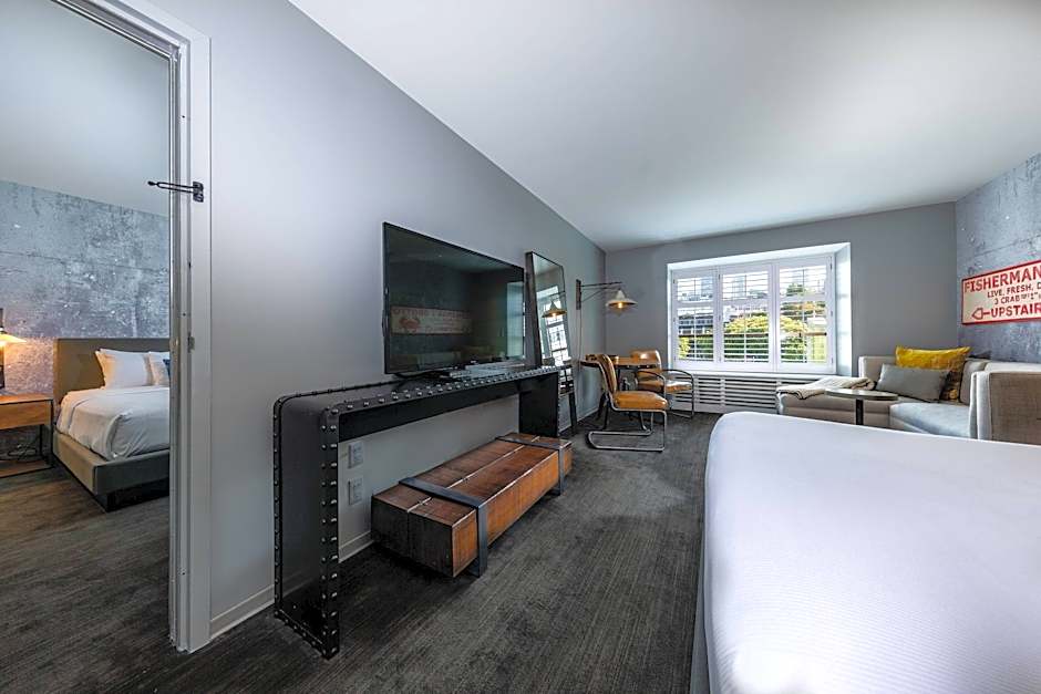 Super close to Fisherman’s wharf. Room was very large with lots of room for everything. Very comfy extra large bed and shower was good. Even though there was no breakfast /dining facilities in the hotel, they did provide Comp coffee/tea, water and small muffins every morning which was really lovely. Laundry facilities were excellent and complimentary and outside area was really great, lots of lounges, fires etc. very quiet. Staff were always friendly and helpful. Good recommendations for nearby eats. Also one of the few hotels that I found that didn’t charge a “ resort tax”