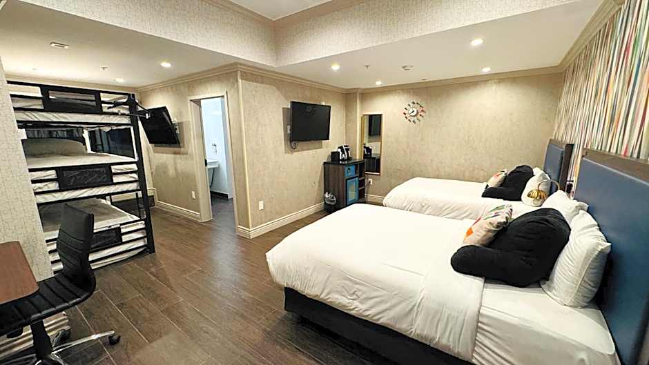 Room options cover a wide spectrum, from cozy doubles to family-friendly configurations. Choices include Family rooms and standard King and Queen setups, plus expansive suites. Specific layouts feature a Family room with two double beds and a bunk bed, a Deluxe Queen Room with a sofa bed, and Suites that pair a King bed or two double beds with extra sleeping space, ideal for larger groups or extended stays.