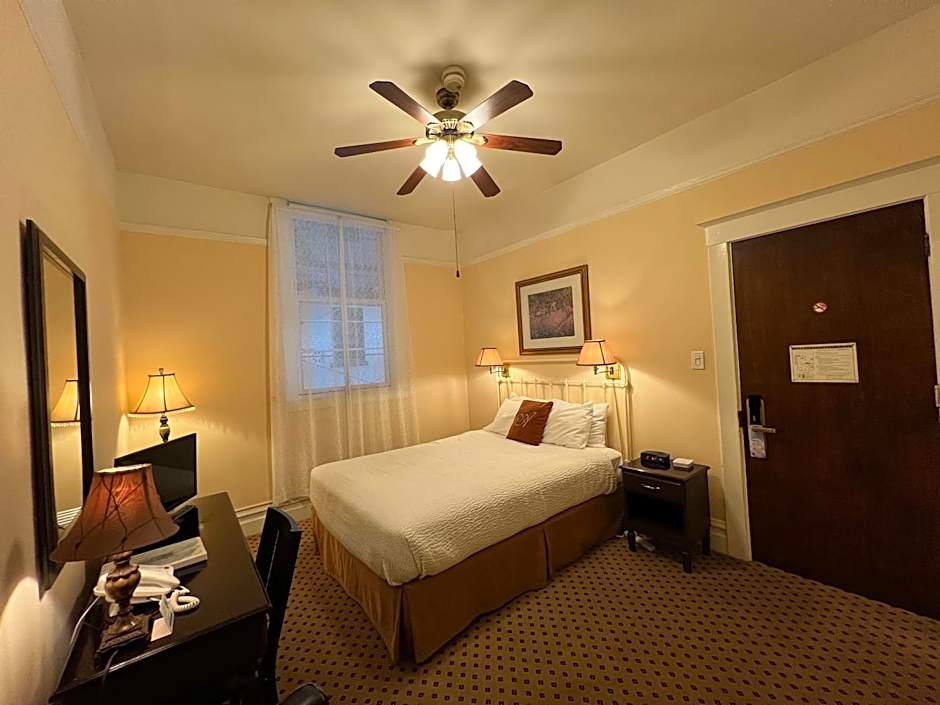 Offering free WiFi, this room is located on a bright and sunny corner overlooking Post Street. It has a seating area at the foot of the bed, a stall shower, a ceiling fan, Queen Anne style curved glass bay windows and a refrigerator.