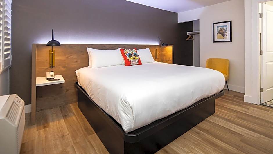 Driving up to the hotel it didn't look like much, but walking in to the lobby was a pleasant surprise! The decor was amazing... painting of Frida Kahlo, sugarskulls, and bright colors. We arrived late and used a techy video console to check in. It connected to a live desk clerk who walked us through check in and emailed us a door code for our room! The room was completely remodeled and modern, with ambient lighting, a huge TV, a Kuerig coffee maker, and a very comfortable bed,