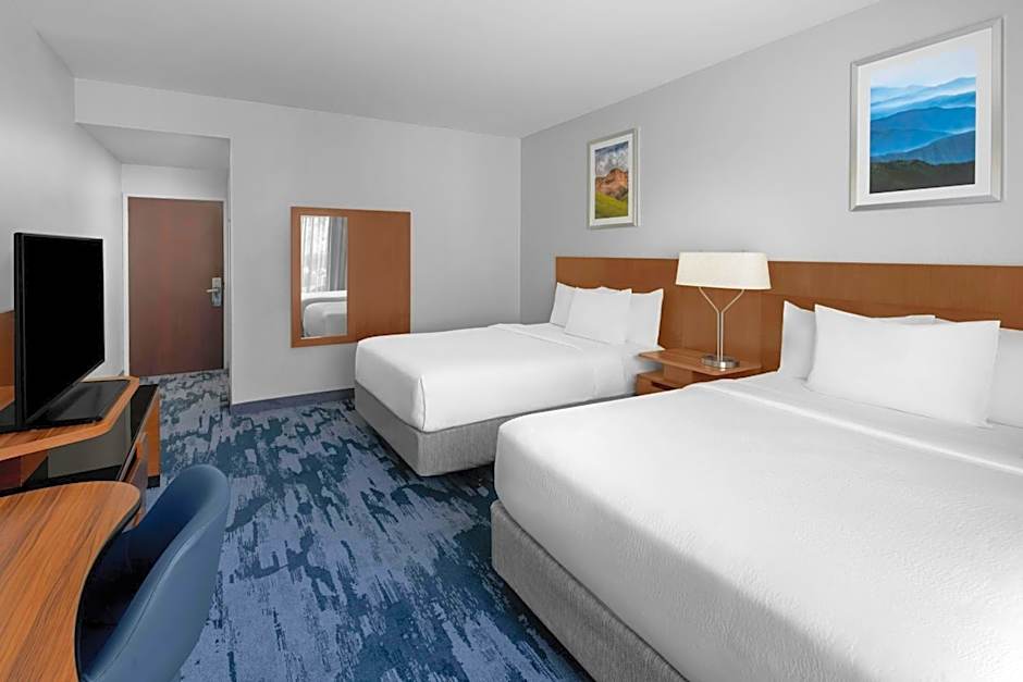 The Fairfield Inn by Marriott Santa Clarita Valencia offers a variety of room types. The King Room is 323 sqft and can accommodate 2 adults and 1 child, with a King size bed. The Queen Room with Two Queen Beds is 344 sqft and can accommodate 4 adults and 3 children, with 2 Queen size beds. The Larger Room with Two Queen Beds and Sofa Bed is 355 sqft and can accommodate 5 adults and 4 children, with 1 sofa bed and 2 Queen size beds. Smoking is not allowed in any of these rooms.