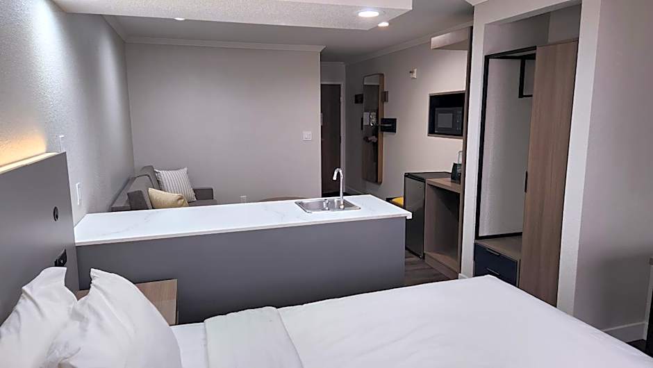 The suite is furnished with a desk and a seating area. The unit has 1 bed.