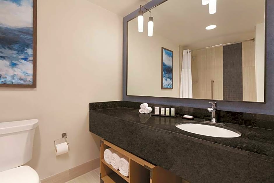 Refreshment Center, WiFi, Keurig coffee brewer, made-to-order breakfast, Evening Reception. Refreshment center access, WiFi, Keurig coffee brewer are all included in our Premium Suites. Refreshment centers on these floors come stocked with non-alcoholic beverages, and snacks. All of our suites include complimentary cooked-to-order full breakfast and Evening Reception featuring beer, wine, premium spirits and light snacks. Treat yourself to a stay in this stylish two-room Premium Suite, complete with one king-sized bed and a separate living room. The furnishings include a sofa bed, armchair and activity table with chairs in the living room, a 37-inch TV in both rooms, and a refrigerator and microwave. The bathroom has a marble vanity, tub with shower and plush white towels.