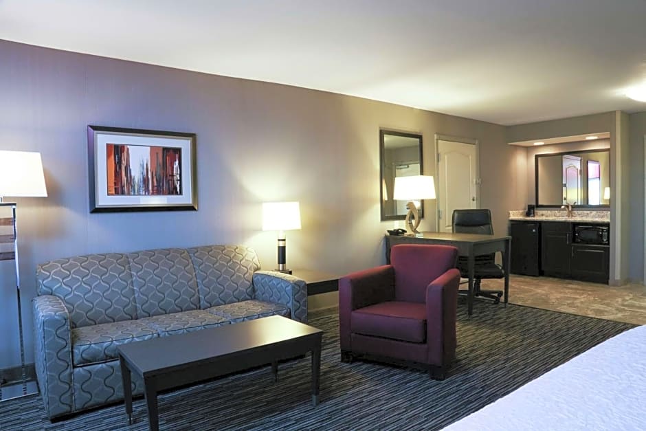 466 sq. ft./43 sq. m., 37-inch HDTV, whirlpool, sofa bed, desk, free WiFi, coffeemaker Relax in this spacious studio suite. Settle down in front of the 37-inch HDTV, catch up on work at the desk and stay connected with free WiFi. This suite also features a coffeemaker. The bathroom includes a shower with a curved rod that allows for more space and light and a soothing whirlpool tub. This suite has one king clean and fresh Hampton bed® and a handy sofa bed.