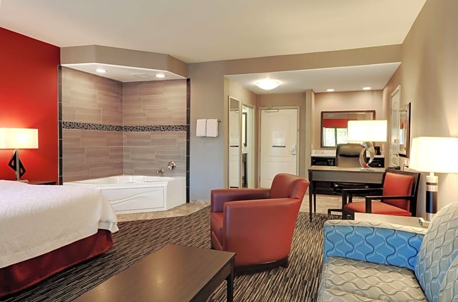 This mobility and hearing accessible, non-smoking suite features one king-sized bed featuring our clean and fresh Hampton bed with faux fireplace. The bath is equipped with accessible bath tub. The suite also has a visual alarm and notification devices for the doorbell or door knock and incoming phone calls. The room features include a microwave, refrigerator, wet bar, comfortable soft seating, a HDTV, and easy to operate alarm clock/radio. The free WiFi internet access will help you stay connected while on the road. If you prefer not to work at the desk, you can use the convenient lapdesk instead. You'll also enjoy the convenience of having a coffeemaker with tea service and iron/ironing board in your room. Any corresponding photo may not reflect the specific accessible room type or room feature.