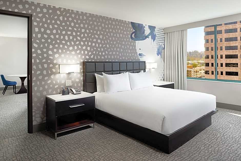 This deluxe corner guest room is on a high floor which features panoramic views of the surrounding mountains and Woodland Hills. The bed is on a platform frame, highlighted with a chic accent wall. Other amenities include USB ports, a large laptop safe, a refrigerator, WiFi, an HDTV, a coffee machine, and premium entertainment options.