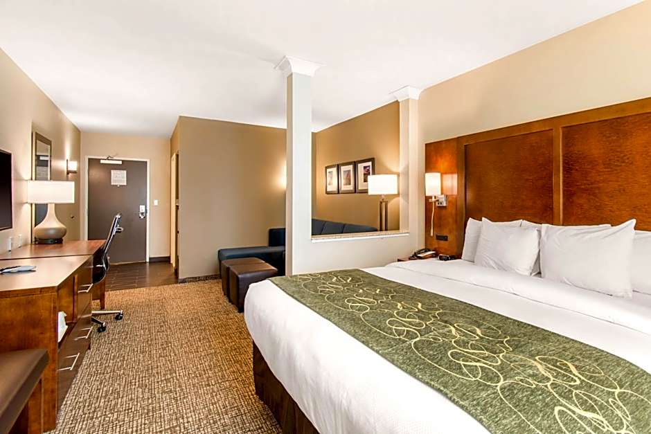 The Comfort Suites Denver near Anschutz Medical Campus offers various types of rooms including Executive Suites with two Queen Beds, Suites with Two Queen Beds (Accessible/Non-Smoking), King Suites, Queen Suites with Living Room, King Suites with Mobility and Hearing Accessible, King Suites (Accessible/Non-Smoking), and King Suites with Spa Bath. All rooms are non-smoking and have a room size of 301 sqft. The occupancy ranges from 2 adults and 1 child to 4 adults and 3 children, depending on the room type.