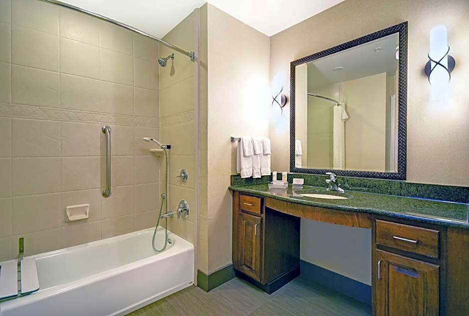 This mobility and hearing accessible non-smoking studio suite features one king-sized bed, and a roll-in shower. This suite also has a visual alarm and notification devices for the doorbell or door knock and incoming telephone calls. This suite has a kitchen built to lower scale with full-sized refrigerator, microwave, dishwasher and twin burner stove - plus utensils - to make dining in easy. For added convenience and flexibility, there is a HDTV, a full-sized sofa bed as well as an additional work table and chair, separate from the dining area table. This suite will keep you connected with complimentary high-speed internet access, telephone, and alarm clock with MP3 player capabilities and pre-set local radio stations. Any corresponding photo may not reflect the specific accessible room type or room feature.