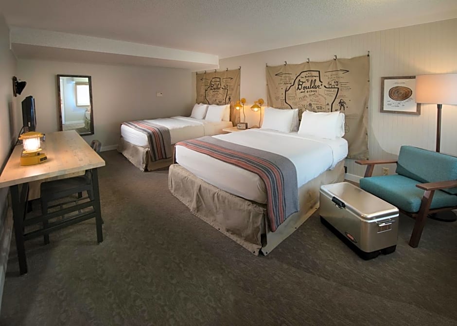 At Basecamp Boulder hotel, the rooms available include the Queen Room with Two Queen Beds - Non-Smoking and the Deluxe King Room - Non-Smoking. The Queen Room can accommodate up to 4 adults and 3 children, while the Deluxe King Room can accommodate 2 adults and 1 child. Both room types do not allow smoking. The Queen Room has two queen-size beds, while the Deluxe King Room has one king-size bed.