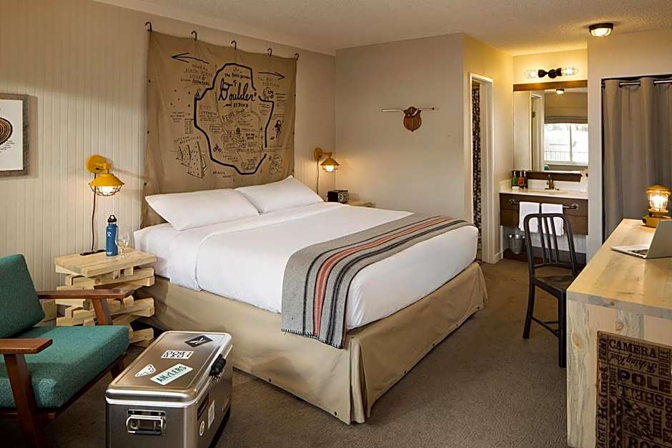 This place has upscale motel vibes with fun amenities like a bouldering wall, lounge with games and ping-pong, fire pits and s’more’s, sauna and hot tub, and on-site bar. I appreciated the outdoorsy decor and pour-over in-room coffee provided. There is a burger shack right next door, and the location is centrally walkable to the university campus, Pearl St and 28th St shops. Very friendly and helpful staff too!