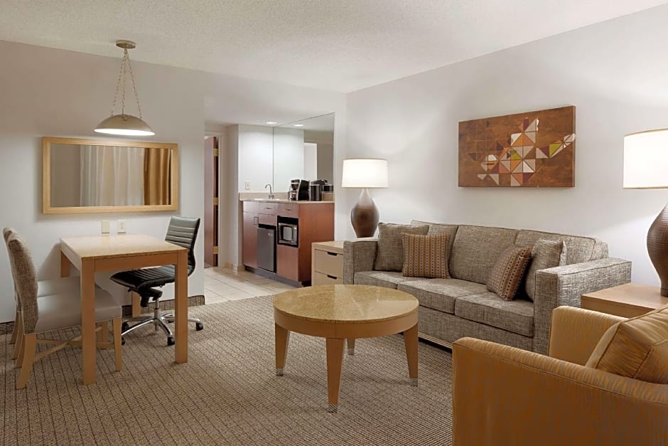 Refreshment Center, WiFi, coffee brewer, cooked-to-order breakfast, Evening Reception. Refreshment center access, WiFi, coffee brewer are all included in our Premium Suites. Refreshment centers on these floors come stocked with non-alcoholic beverages and snacks. All of our suites include complimentary cooked-to-order breakfast and Evening Reception featuring beer, wine, premium spirits and light snacks. This mobility accessible premium suite features one king-sized bed and an accessible tub. The room also has a visual alarm, and notification devices for the doorbell or door knock and incoming telephone calls. Furnishings include sofa bed, armchair, activity table with upholstered chairs, 200 thread-count bed linens, two 42-inch flat-screen televisions, alarm clock radio with MP3 connection, refrigerator and microwave oven. Any corresponding photo may not reflect the specific accessible room type or room feature.