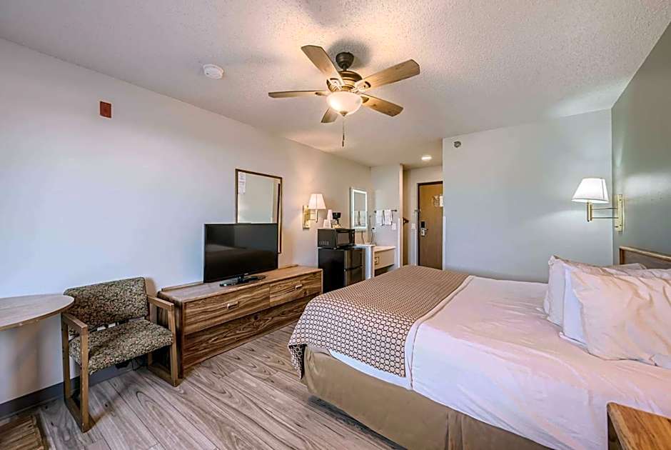 The hotel offers Studio Suites and Queen Rooms. The Studio Suites have two Queen beds and are available in smoking and non-smoking options. They have a room size of 280 sqft and can accommodate up to 6 adults and 4 children. The Queen Rooms have either one Queen bed or two Queen beds and are also available in smoking and non-smoking options. They have a room size of 205 sqft and can accommodate up to 4 adults and 3 children. The hotel also offers King Rooms, which have one King bed, and are available in smoking and non-smoking options. They have a room size of 205 sqft and can accommodate up to 2 adults and 1 child.