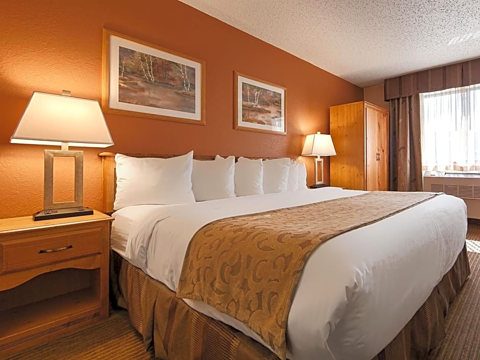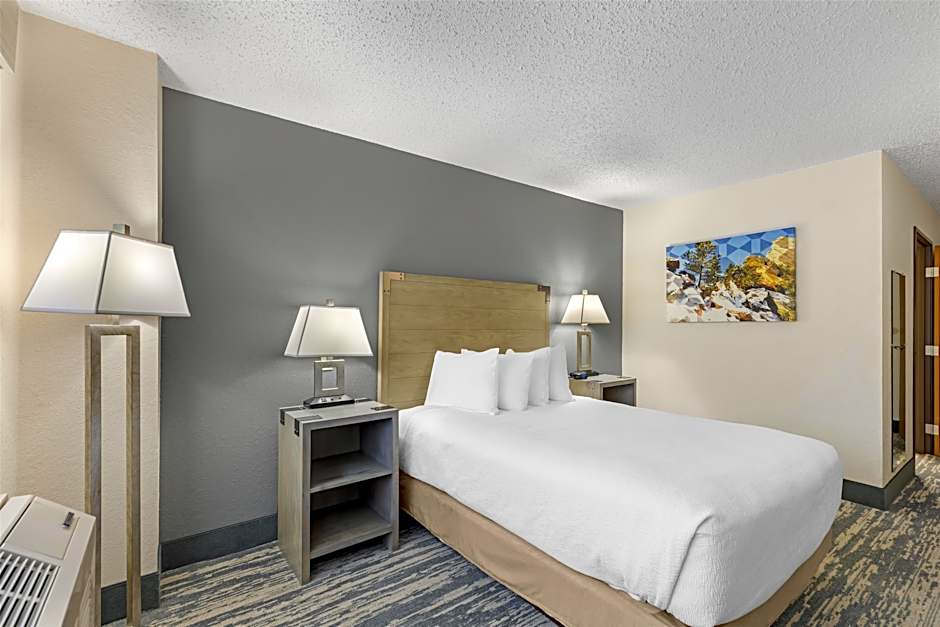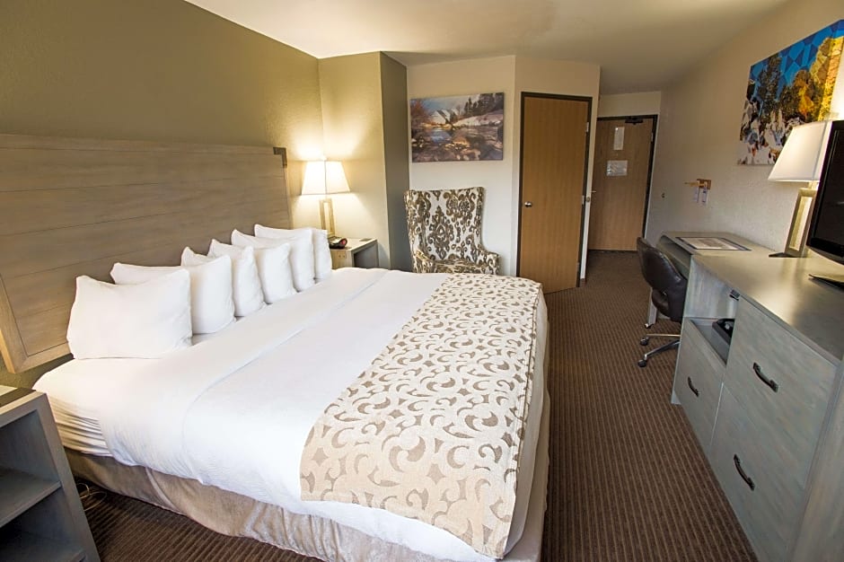 The Best Western Alpenglo Lodge offers a variety of room options. They have King Rooms with Disability Access, Deluxe Queen Rooms with Two Queen Beds, Deluxe King Rooms, Queen Rooms with Two Queen Beds and Disability Access, Deluxe Queen Rooms with Two Queen Beds and Mountain View, Deluxe King Rooms with Mountain View, and Queen Rooms with Two Queen Beds that are Pet Friendly. None of the rooms allow smoking. The rooms accommodate either 2 adults and 1 child or 4 adults and 3 children, and the bed sizes range from King to Queen.
