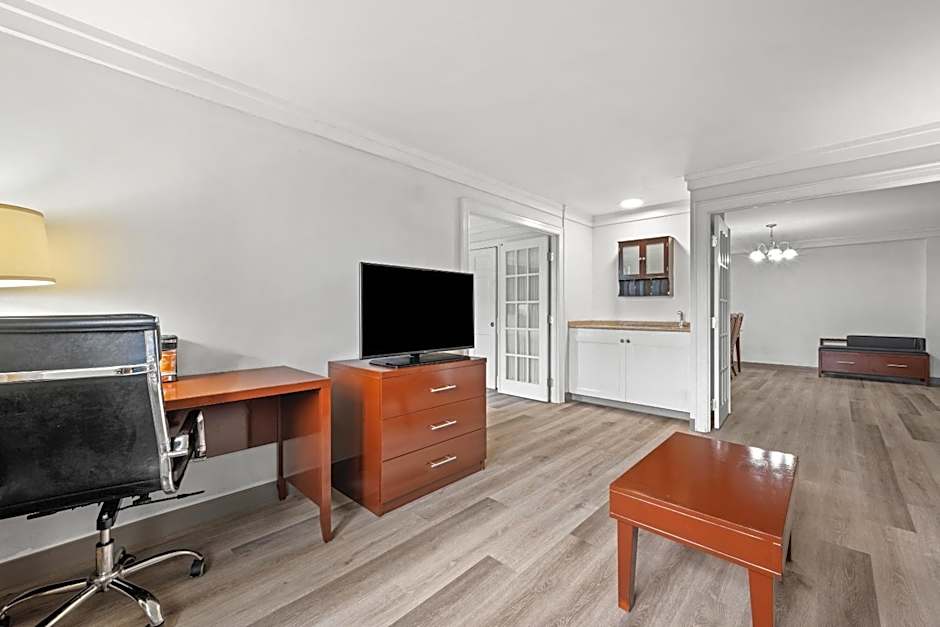 This suite has a bath tub, a living room, 32-inch TV, microwave, refrigerator, desk, coffee maker, HBO, iron and ironing board.