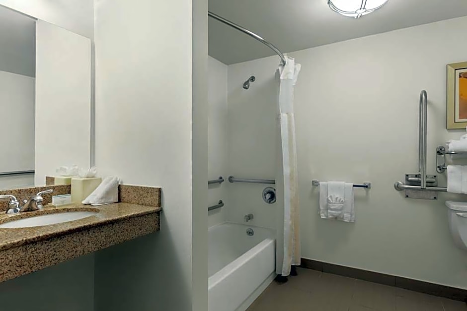 This mobility accessible standard room features one king-sized bed, and an accessible tub, chair with ottoman, small refrigerator, microwave, premium coffeemaker, 36-inch flat-screen HDTV, work desk with complimentary WiFi, hair dryer, iron & board. Any corresponding photo may not reflect the specific accessible room type or room feature.