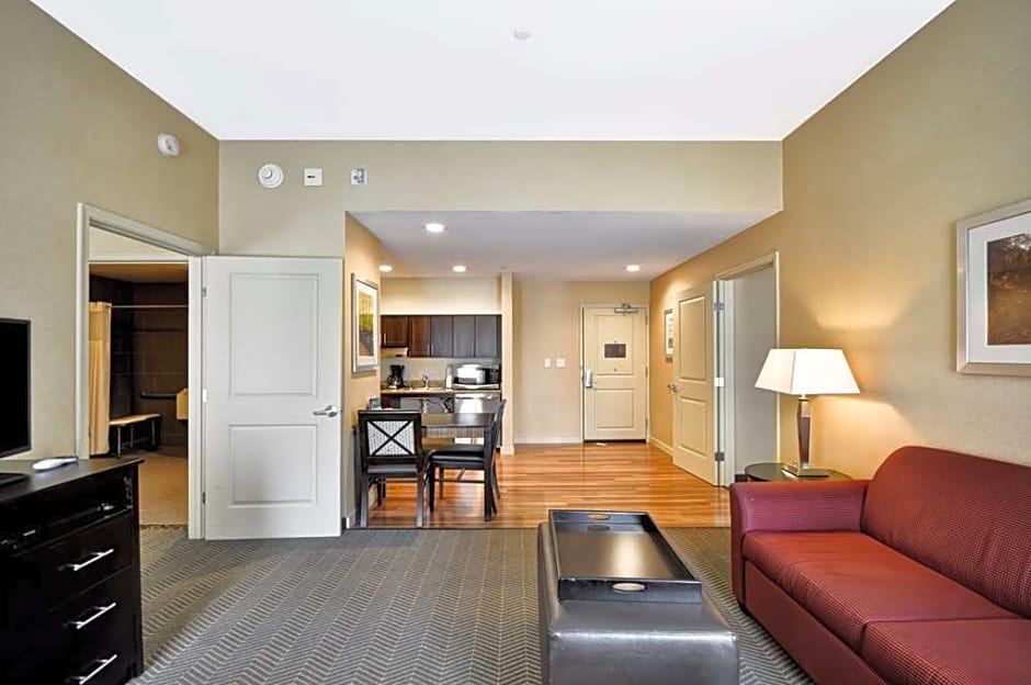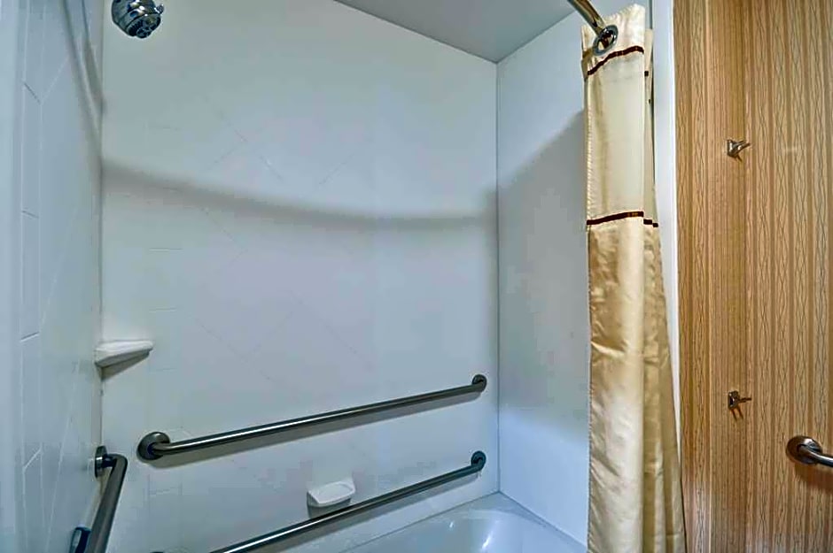 This mobility and hearing accessible non-smoking studio suite features one king-sized bed and an accessible bathtub. This suite also has a visual alarm and notification devices for the doorbell or door knock and incoming telephone calls. This suite has a kitchen built to lower scale with full-sized refrigerator, microwave, dishwasher and twin burner stove - plus utensils - to make dining in easy. For added convenience and flexibility, there is an HDTV, a full-sized sofa bed as well as an additional work table and chair, separate from the dining area table. This suite will keep you connected with complimentary guest internet access, telephone, and alarm clock with MP3 player capabilities and pre-set local radio stations. Any corresponding photo may not reflect the specific accessible room type or room feature.