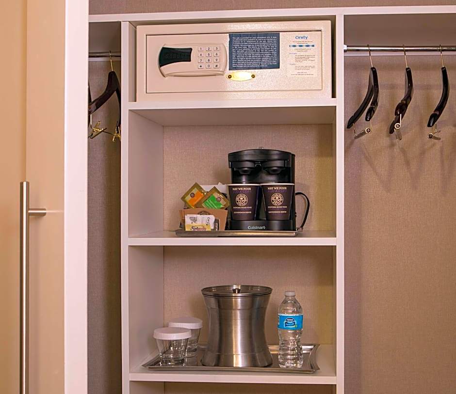 This king room is located on the first floor and opens into the outdoor Courtyard, where you will find the Courtyard Garden. The room features a coffee maker, tabletop lamp with built-in power outlets and USB port, a work desk and chair, and a 42 inch TV with On Demand and HBO.