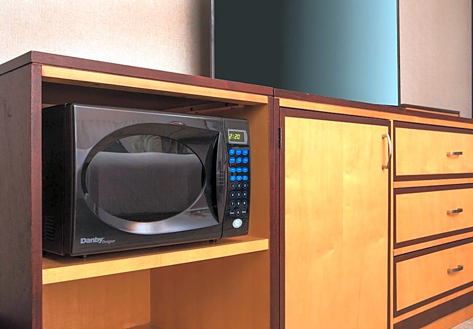 This room features a microwave and is a larger room. Other amenities include 42-inch LG TV with On Demand and HBO, iHOME clock with docking station, refrigerator, work desk and ergonomic chair, coffeemaker, WiFi, armchair, tabletop lamp with power outlets and USB port, and other standard room amenities.