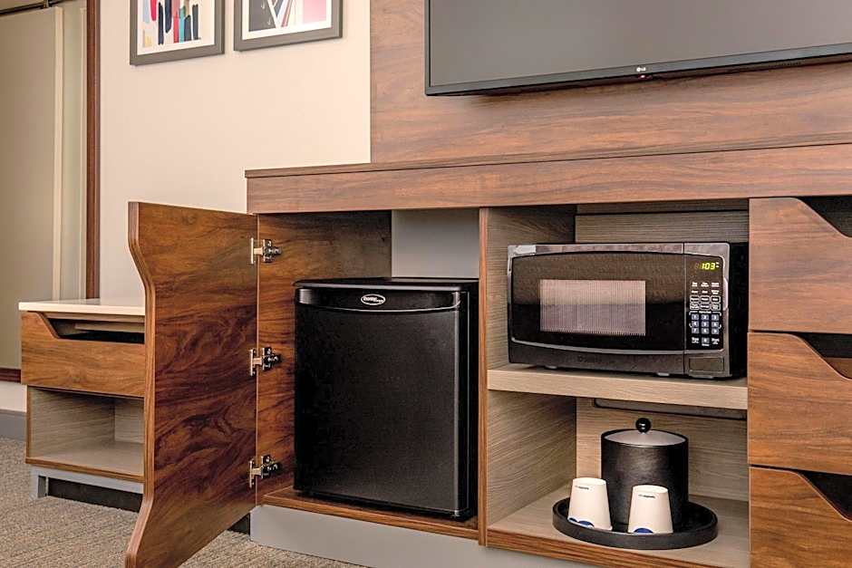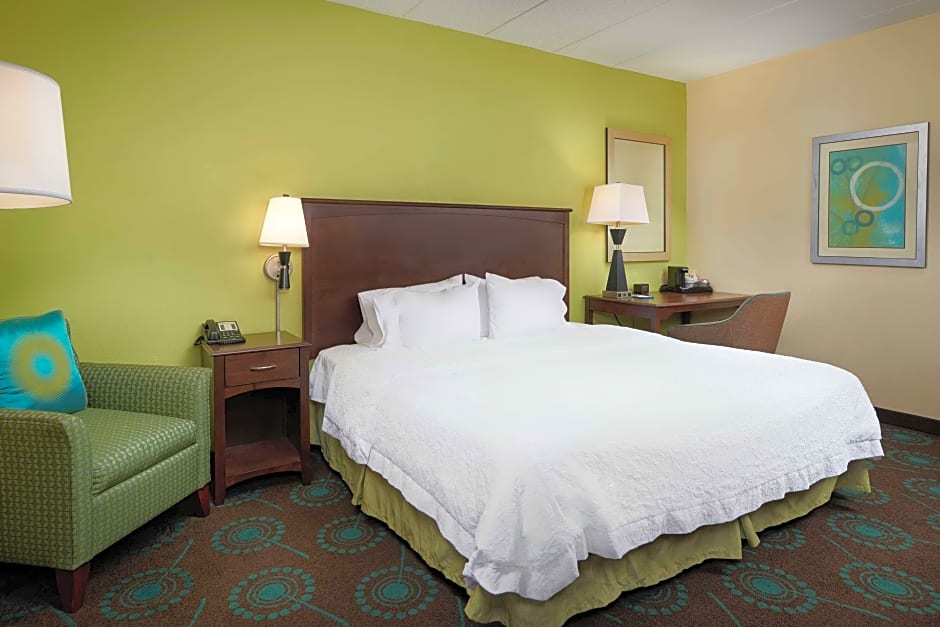 Free WiFi access, whirlpool tub, HDTV, easy chair & ottoman, work desk, coffeemaker Enjoy your stay in this spacious non-smoking room which features one king-sized clean and fresh Hampton bed® and a relaxing whirlpool tub. Unwind in the easy chair and watch a movie on the 25-inch HDTV or work at the large desk and stay connected with free WiFi access. Savor a freshly brewed coffee from the coffeemaker provided. The bathroom offers plush towels and a shower with a Waterpik® showerhead and curved shower rod which allows more light and space in the shower.