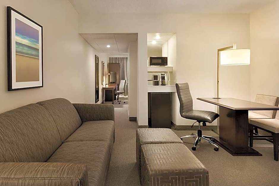 This mobility accessible standard suite features one king-sized bed, and an accessible tub. Our suites are tastefully furnished with a sofa bed, armchair, activity table with upholstered chairs, two 32-inch flat-screen LCD HDTV televisions, alarm clock radio with MP3 connection, refrigerator and microwave oven. The bath features granite vanity and mobility access tub. The bath is appointed with plush white towels and a rounded shower rod for extra space and comfort. Enjoy our complimentary cooked-to-order breakfast and Evening Reception during your stay. This gives you the ability to tailor your own breakfast experience, as well as allowing you to easily unwind and relax in the evening after a long day of work or fun. Each suite, as well as the hotel, is equipped with WiFi. A nominal fee may apply for WiFi access. Any corresponding photo may not reflect the specific accessible room type or room feature.