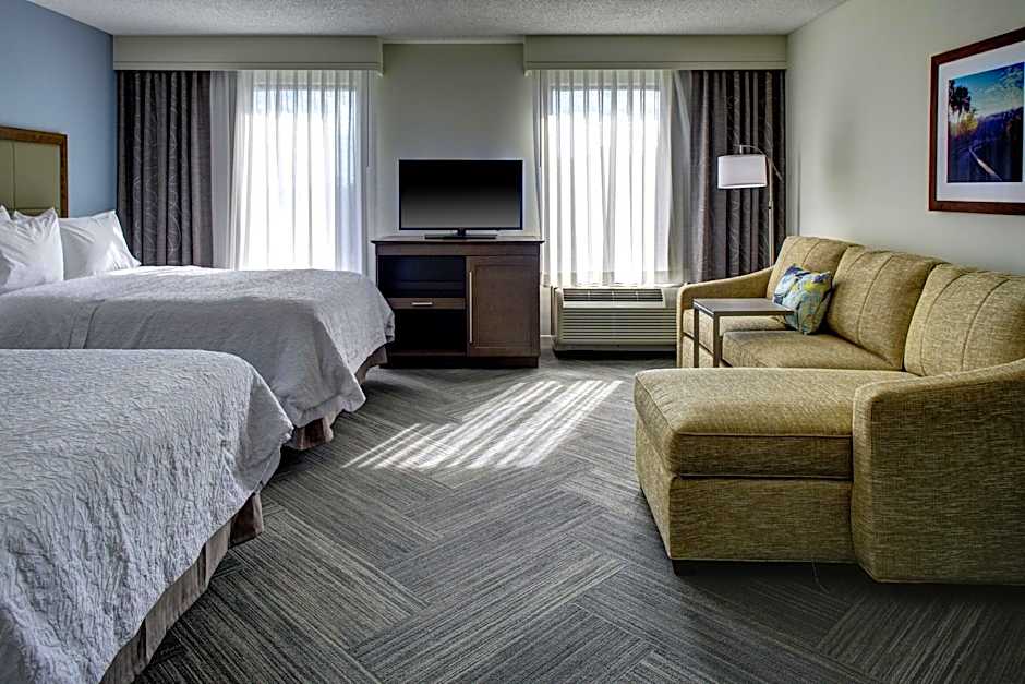 Settle into this spacious non-smoking studio suite which contains two queen-sized beds and a plush sofa bed. The room features our clean and fresh Hampton bed®, comfortable soft seating, microwave, refrigerator, a HDTV and easy to operate alarm clock/radio. The free WiFi will help you stay connected while on the road. You'll also enjoy the convenience of having a coffeemaker with tea service and iron/ironing board in your room.