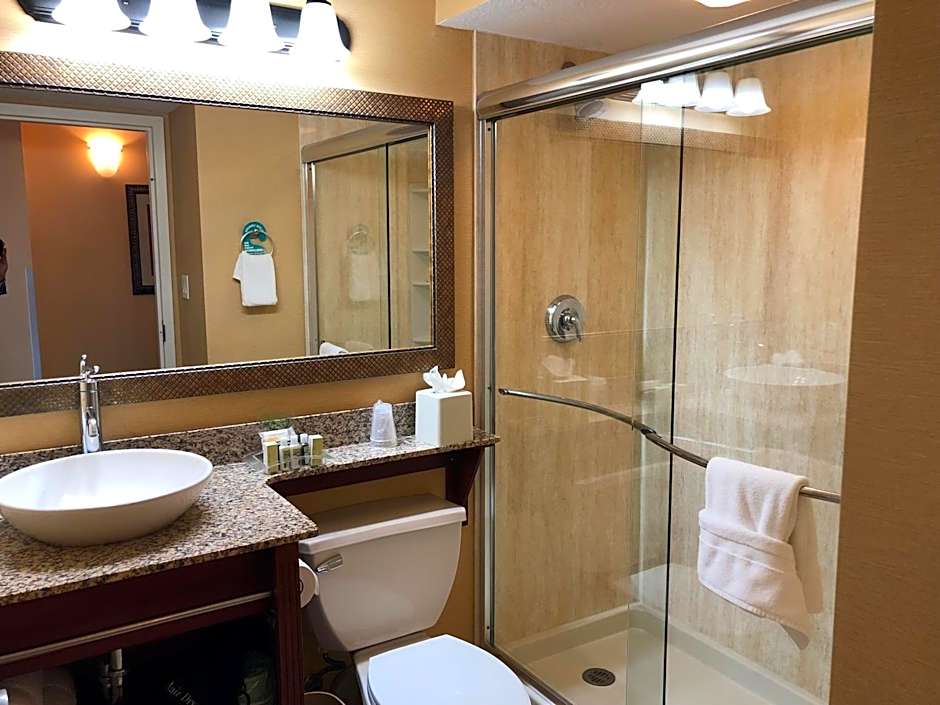 tastefully decorated room upgraded bath amenities granite countertops rounded shower curtain 32 inch LCD flat screen HD TV and complimentary HSIA