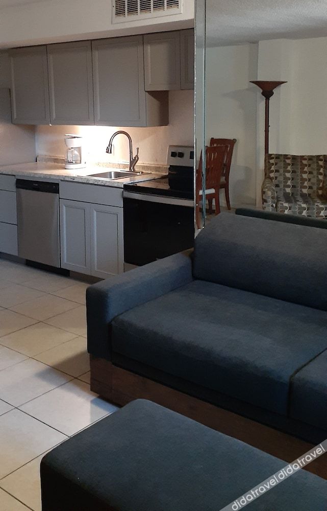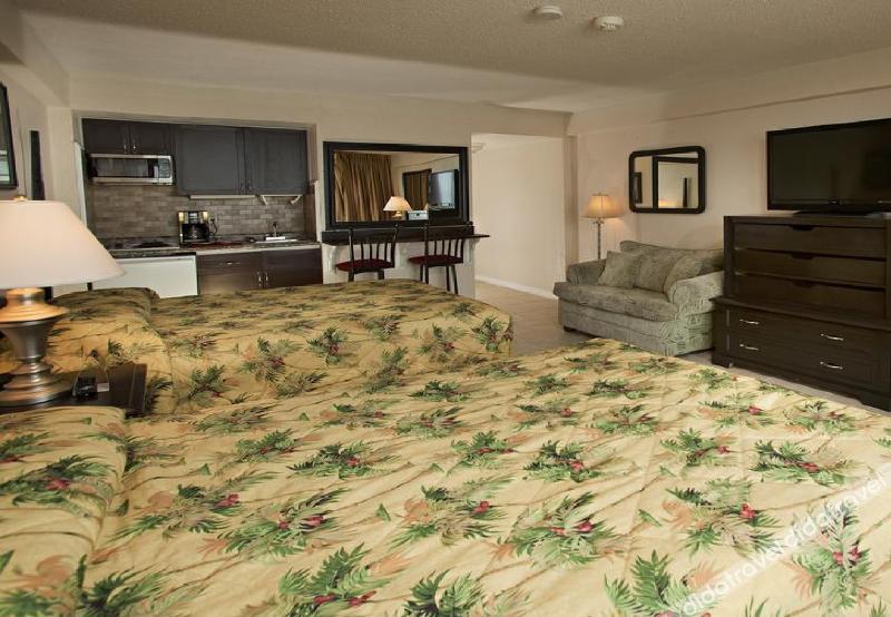 One king bed or two queen beds. Oceanfront room with balcony. Located on floors 1–5. Hawaiian-themed decor. TV with HBO. Fully equipped kitchenette with refrigerator, Full stove or dual stove top, coffee/tea maker, and microwave. In-room safe (surcharge).