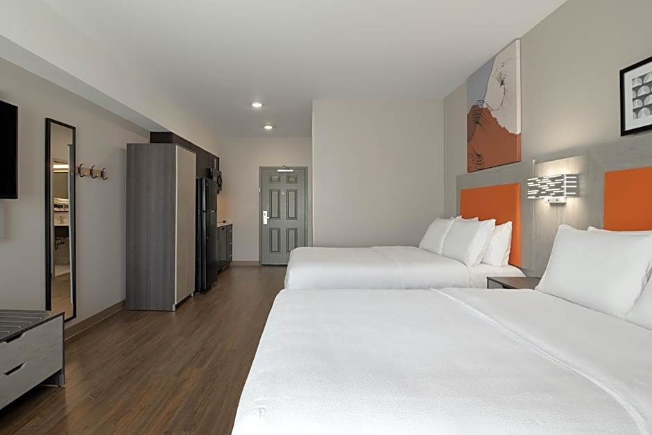 Our spacious Queen Room with Two Queen Beds is perfect for families or groups of friends, accommodating up to 4 adults and 3 children. With 420 sqft of space, this non-smoking room features private bathroom, flat-screen TV, microwave, refrigerator, and more, ensuring a comfortable stay for all guests.
