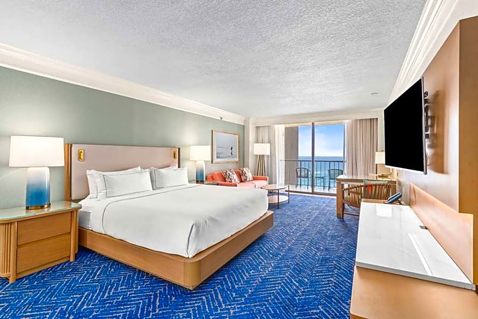 This suite features a private balcony with a beach view, microwave, and refrigerator. Extras include a flat-screen cable TV, wet bar, and private bathroom with double vanity.